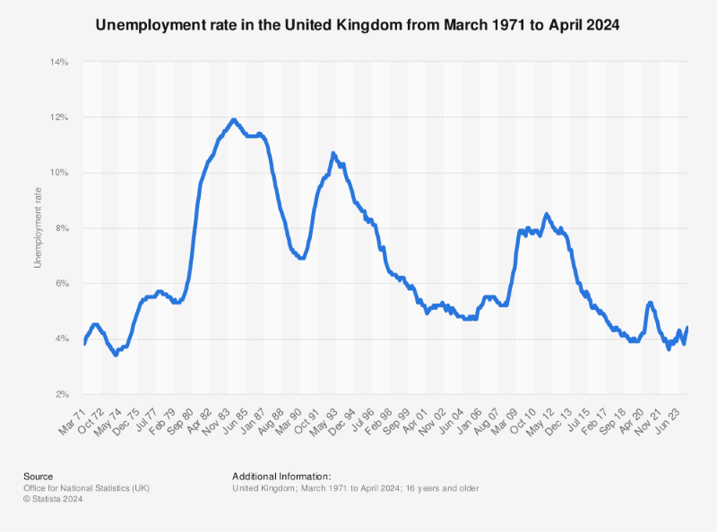 Chart illustrating the UK’s unemployment rate since early 1971, climbing to 4.4% in recent months.